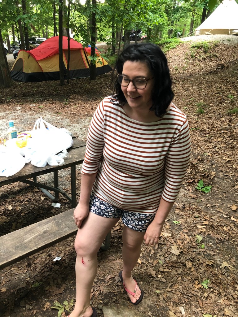 The tent was up, rain fly secured beautifully with help from a friend. While guests sat around the campfire relaxing, she busied about prepping the burgers and ramming her leg into the water spigot. A deep gash is still healing and will leave a scar. She’d relive the whole evening in a heartbeat.