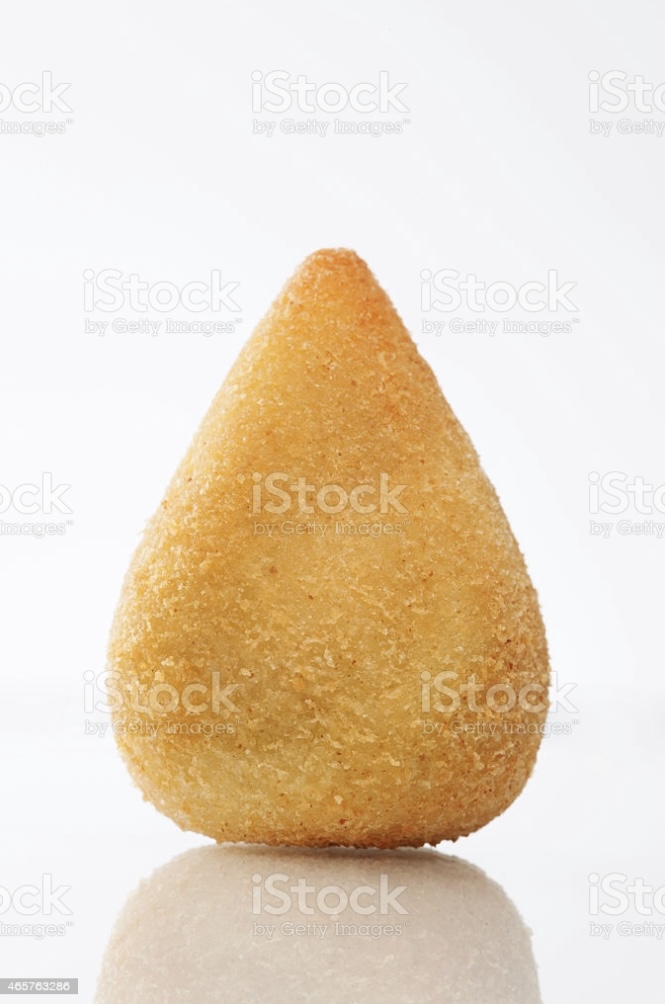 They stopped at a Brazilian breakfast/lunch counter and bakery to share a coxinha (“co-she-nyah:” teardrop shaped balls of dough filled with chicken, green olives, and cream cheese; breaded and deep fried; pictured below)and a bridgadeiro (Brazilian chocolate confection)
